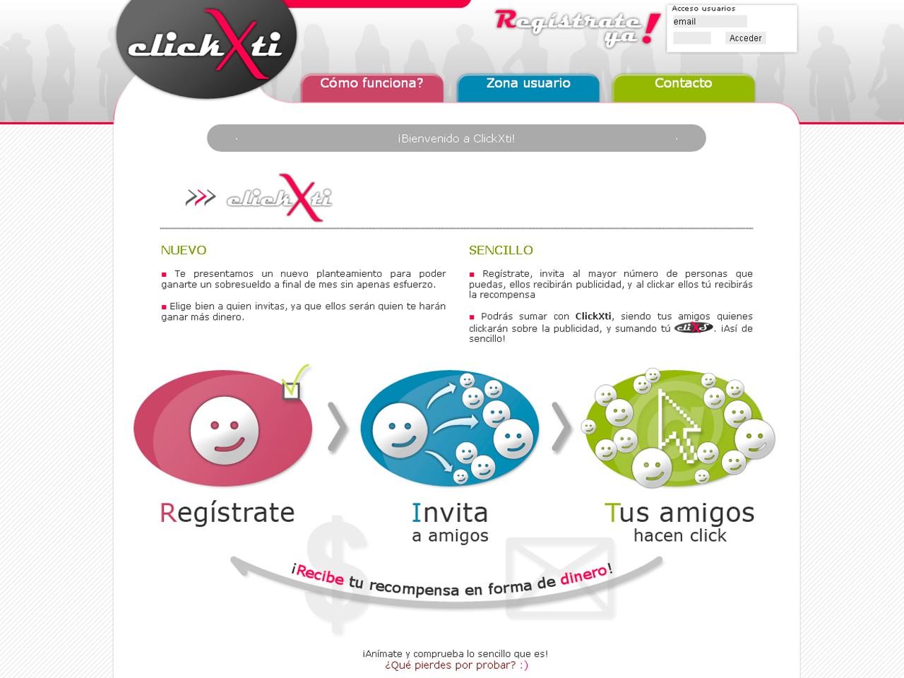 Ganar dinero con Clickxti es fácil. Solo tienes que registrarte (gratuitamente) y recibirás emails a tu correo con anuncios de empresas y promociones. Solo tienes que hacer click en el anuncio, ver lo que ofrecen y ya está! recibirás dinero por ello.
